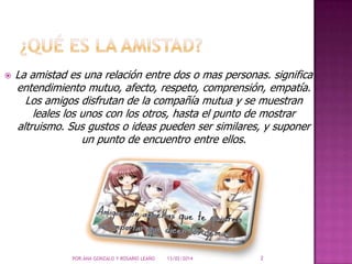 El documento define la amistad como una relación entre dos o más personas basada en el entendimiento mutuo, afecto, respeto y comprensión. Los amigos disfrutan de la compañía mutua y se muestran leales, compartiendo gustos e ideas similares. El documento también describe diferentes tipos de amistades y ofrece consejos para relacionarse con los demás.