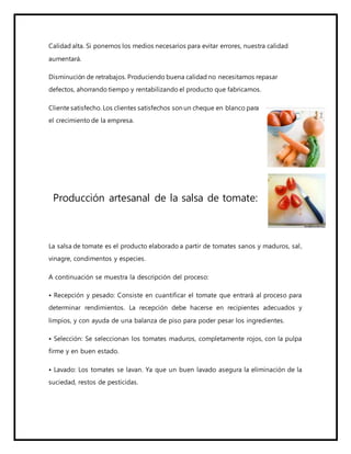 Poka yoke es una técnica de calidad que busca prevenir errores en los procesos de producción. El objetivo es hacer que los errores sean imposibles o evidentes para corregirlos rápidamente. Un ejemplo es la producción artesanal de salsa de tomate, donde se propone implementar un dispositivo poka yoke para prevenir derrames durante el envasado y mejorar el control del proceso.