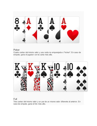 El documento describe las diferentes manos en el poker, desde la mano más fuerte que es la escalera real de as, rey, reina, jota y diez del mismo palo, hasta una carta alta. Las manos se ordenan de mayor a menor valor dependiendo del número y valor de las cartas iguales, y en caso de empate se gana con la carta o cartas más altas.