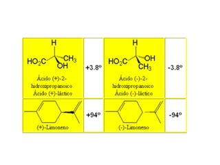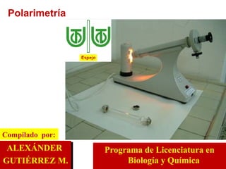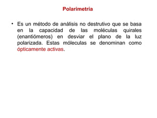 El documento describe la polarimetría, un método de análisis químico no destructivo que mide la capacidad de moléculas quirales para desviar la luz polarizada. Las moléculas quirales, llamadas ópticamente activas, desvían el plano de la luz polarizada en sentidos opuestos. El polarímetro mide esta rotación específica para determinar si una molécula es dextrógira o levógira. Una mezcla equimolar de enantiómeros se denomina mezcla racémica y no des