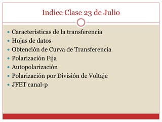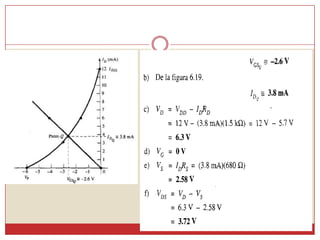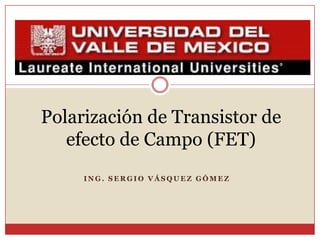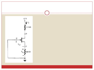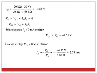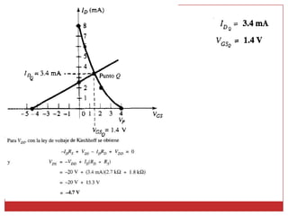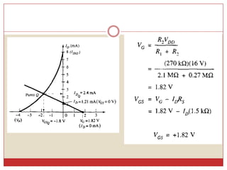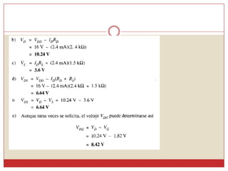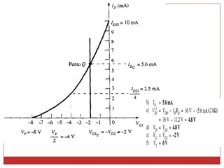 Este documento describe diferentes métodos para obtener la curva de transferencia de un transistor de efecto de campo (FET), incluido el uso de las características de salida, la ecuación de Schokley y un método rápido. También explica varias técnicas de polarización de FET, como la polarización fija, la autopolarización y la polarización por división de voltaje. Finalmente, presenta una curva universal de polarización para FET que puede usarse para cualquier nivel de corriente de saturación y voltaje de puerta.