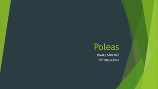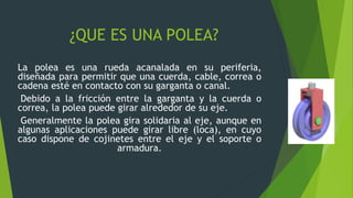 La polea es una rueda acanalada que permite que una cuerda, cable o cadena esté en contacto con su canal central, girando alrededor de su eje debido a la fricción. Las poleas se utilizan para elevar objetos pesados o transmitir movimiento entre ejes, y existen diferentes tipos: la polea fija cambia la dirección de la fuerza aplicada pero requiere la misma fuerza para elevar la carga, mientras que la polea móvil reduce a la mitad la fuerza necesaria pero requiere tirar el doble de cuerda
