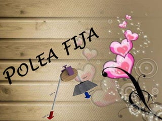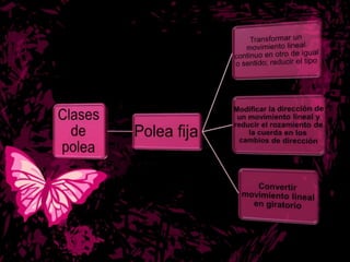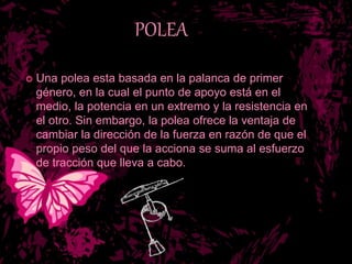 Este documento describe las características de las poleas. Explica que una polea funciona como una palanca de primer orden y permite cambiar la dirección de la fuerza aplicada. Describe dos tipos de poleas: las poleas fijas, que transmiten movimiento sin ventaja mecánica, y las poleas móviles, que permiten reducir la fuerza necesaria. Finalmente, incluye enlaces web para obtener más información sobre poleas.