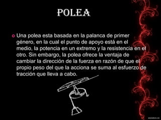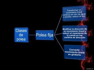 La polea fija transmite movimiento para mover una carga sin necesidad de fuerza, funcionando como una palanca de primer tipo con el eje fijo y requiriendo la misma magnitud de fuerza aplicada que la de la carga movida. Describe las características básicas y usos de la polea fija.