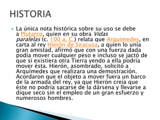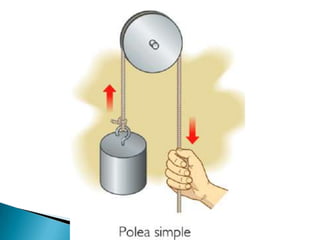 El documento describe la polea y su historia. Menciona que Plutarco relató que Arquímedes afirmó poder mover cualquier peso con la fuerza adecuada, como demostrar moviendo un barco del rey. Luego define la polea como una rueda con una ranura por la que pasa una cuerda para cambiar la dirección del movimiento. Explica que están compuestas de rueda, brazos y eje, pudiendo ser de ojo o de eje móvil. Finalmente, señala que los polipastos usan múltiples pole