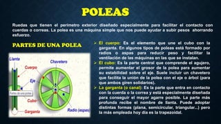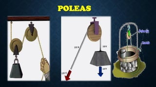 La polea es una rueda que se usa para cambiar la dirección o transmitir movimiento mediante cuerdas o correas. Tiene tres partes principales: el cuerpo, el cubo y la garganta. Se pueden clasificar como fijas, móviles o compuestas. Las poleas simples fijas no ofrecen ventaja mecánica, mientras que las móviles reducen a la mitad la fuerza necesaria para elevar una carga. Las poleas compuestas como los polipastos incrementan aún más esta ventaja al usar múltiples poleas