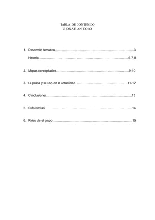 Este documento presenta información sobre poleas y engranajes. Explica los tipos de poleas, sus partes y usos históricos y actuales. También describe los engranajes, incluyendo sus partes, características y aplicaciones. La historia del desarrollo de ambos mecanismos se resume desde la antigüedad hasta la actualidad.