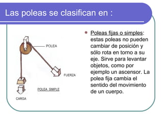 Las poleas sirven principalmente para transmitir movimiento y cambiar la dirección de los objetos sin incrementar la fuerza aplicada. Se clasifican en poleas fijas, móviles y compuestas. Las poleas fijas cambian la dirección del movimiento, mientras que las móviles permiten mover cargas con la mitad de la fuerza. Las compuestas disminuyen aún más el esfuerzo requerido al combinar varias poleas. Otros mecanismos como planos inclinados, ruedas y engranajes también ayudan a transmitir y mod