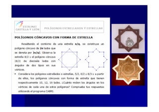 Este documento presenta información sobre polígonos estrellados y formas estrelladas. Explica dos métodos para construir polígonos estrellados uniendo vértices o prolongando lados de un polígono regular. Luego describe ejemplos como el pentagrama, hexagrama y formas derivadas de ellos. Finalmente, analiza el uso de estas formas en la arquitectura de catedrales.