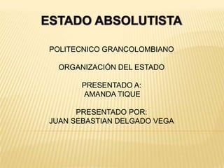 El documento describe el estado absolutista, donde el monarca ejerce un poder absoluto sin rendir cuentas, y se apoya en el derecho divino para justificar su autoridad. Este sistema político predominó en Europa, especialmente en España, Francia e Inglaterra, hasta ser derrocado por diversas revoluciones liberales en los siglos XVIII y XIX. La decadencia del absolutismo se debió a la intolerancia religiosa y la arbitrariedad política, que llevaron a demandas de un estado liberal y democrático.