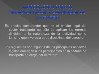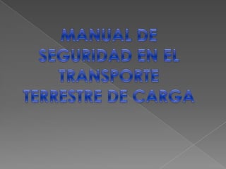 Este documento resume los principales aspectos legales, procedimientos y recomendaciones relacionados con el transporte terrestre de carga en Colombia. Detalla las normas de derecho penal, administrativo y civil aplicables, así como los requisitos para el transporte de mercancías peligrosas y sustancias químicas controladas. También cubre temas como el control operativo, los seguros, la inspección de contenedores y el reporte de operaciones sospechosas.