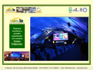 Ofrecemos carpas poligonales para organizar conciertos y grandes espectáculos, con capacidad tanto para el interior como el exterior de la finca de Montealegre.