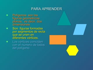 Los polígonos son figuras geométricas planas formadas por segmentos de recta unidos en vértices. Se clasifican como regulares o irregulares dependiendo de si sus lados y ángulos interiores son iguales o no. Los polígonos se nombran según su número de lados, como triángulo con 3 lados y cuadrilátero con 4 lados. Dentro de los cuadriláteros están los paralelogramos cuyos lados opuestos son paralelos, como el cuadrado, rectángulo y rombo.