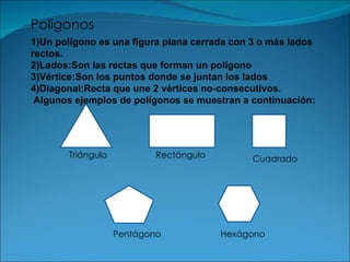 Este documento proporciona una introducción a los polígonos. Define un polígono como una figura plana cerrada con 3 o más lados rectos. Explica los componentes básicos de un polígono como lados, vértices y diagonales. Además, clasifica los polígonos de acuerdo a su número de lados, forma de su región interior y grado de regularidad de sus lados y ángulos. Finalmente, presenta algunas fórmulas básicas relacionadas con polígonos convexos.