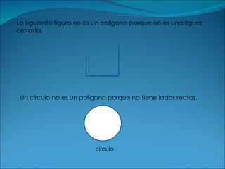 Este documento proporciona una introducción a los polígonos. Define un polígono como una figura plana cerrada con 3 o más lados rectos. Explica los componentes básicos de un polígono como lados, vértices y diagonales. Además, clasifica los polígonos de acuerdo con el número de lados, la forma de su región interior y la medida de sus lados y ángulos. Finalmente, presenta algunas fórmulas básicas relacionadas con polígonos convexos.