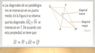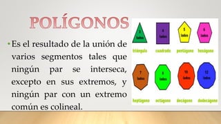 El documento describe las características de los polígonos, enfocándose en los cuadriláteros. Se explica la definición de un cuadrilátero, sus pares de lados opuestos y consecutivos, además de detallar el trapecio y los trapezoides. El trapecio es un cuadrilátero con dos lados paralelos, mientras que los trapezoides carecen de esta propiedad.
