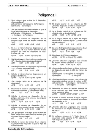 Este documento contiene 26 preguntas sobre las propiedades de los polígonos regulares e irregulares. Las preguntas cubren temas como el número de lados, diagonales, ángulos interiores y exteriores de diferentes polígonos. Los estudiantes deben identificar el tipo de polígono u obtener valores numéricos relacionados con sus características geométricas.