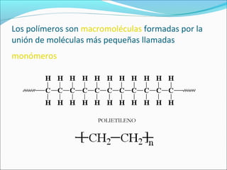 Los polímeros son macromoléculas formadas por la unión de moléculas más pequeñas llamadas monómeros. Pueden clasificarse según su naturaleza química, mecanismo de formación, aplicaciones, comportamiento térmico, tipos y cantidad de monómeros, y composición química. Algunos polímeros comunes son el polietileno, polipropileno, poliuretano y PVC. Se utilizan en prendas, artículos domésticos, electrónica y más.