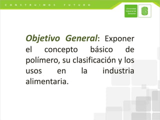 Este documento presenta información sobre los polímeros en alimentos. Explica que los polímeros son macromoléculas formadas por la unión de moléculas pequeñas llamadas monómeros. Los polímeros naturales más comunes en alimentos son el almidón y la celulosa. El almidón proporciona entre el 70-80% de las calorías en la dieta y se utiliza como espesante y aglutinante en alimentos procesados. La celulosa es un polímero de glucosa insoluble en agua que se encuentra de forma abundante