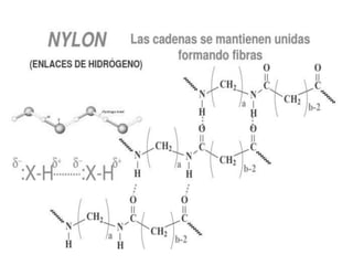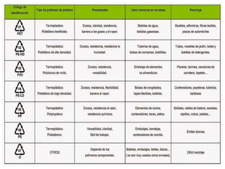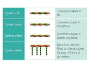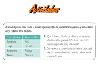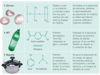 Este documento describe la clasificación y propiedades de los polímeros. Explica que los polímeros se pueden clasificar como naturales o sintéticos, y estos últimos pueden sintetizarse por polimerización por adición o por condensación. También describe algunos polímeros importantes como el polietileno, el PVC, el nailon y el PET, e indica sus usos comerciales. Finalmente, analiza el impacto ambiental de los plásticos y formas de degradación de los mismos.