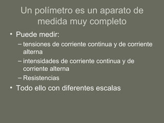 Un polímetro es un instrumento que puede medir voltaje, corriente, resistencia y probar diodos y transistores. Tiene una pantalla y un selector de escala y modo que permite cambiar entre las diferentes funciones. Mide voltaje continuo y alterno, corriente continua y alterna, y resistencia usando diferentes escalas seleccionadas por el usuario.