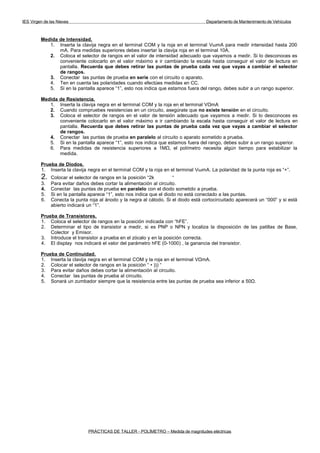 Este documento proporciona instrucciones para el uso de un polímetro digital 830 L para medir magnitudes eléctricas como voltaje, corriente, resistencia, y probar diodos y transistores. Explica cómo encender el polímetro, seleccionar el rango apropiado, y conectar las puntas para diferentes mediciones, siempre siguiendo procedimientos de seguridad. También describe las partes del polímetro y cómo realizar pruebas de continuidad y medir la ganancia de transistores.