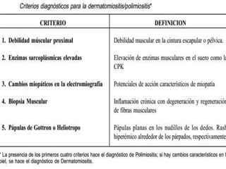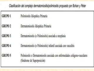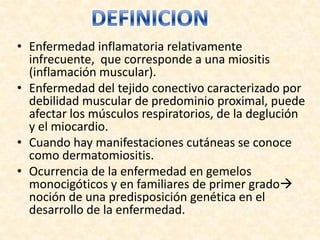 La polimiositis y la dermatomiositis son enfermedades inflamatorias musculares caracterizadas por debilidad muscular proximal y erupciones cutáneas respectivamente. La polimiositis afecta principalmente los músculos esqueléticos mientras que la dermatomiositis también presenta manifestaciones cutáneas como erupciones en la piel. Ambas condiciones pueden causar daño muscular grave si no se tratan y se han relacionado con un mayor riesgo de cáncer. El tratamiento principal involucra corticosteroides e inmunosupres