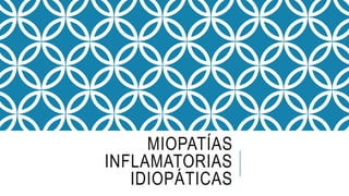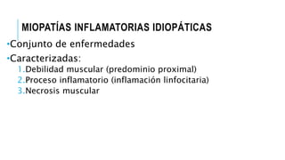 Este documento describe las miopatías inflamatorias idiopáticas, un conjunto de enfermedades musculares caracterizadas por debilidad muscular, procesos inflamatorios y necrosis muscular. Se clasifican en polimiositis, dermatomiositis y miositis con cuerpos de inclusión. Su etiología es desconocida pero involucra factores genéticos y ambientales. El tratamiento de elección son los glucocorticoides, con inmunosupresores e inmunoglobulina como alternativas. El pronóstico general es bueno pero emp