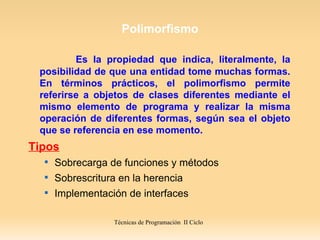 El documento habla sobre el polimorfismo en Java. Explica que el polimorfismo permite referirse a objetos de diferentes clases mediante el mismo elemento de programa y realizar la misma operación de diferentes formas dependiendo del objeto. Menciona que existen tres técnicas de polimorfismo: sobrecarga de funciones y métodos, sobrescritura en la herencia e implementación de interfaces. Proporciona ejemplos de cada una.