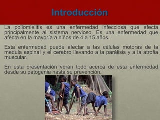 La poliomielitis es una enfermedad infecciosa causada por el poliovirus que afecta principalmente el sistema nervioso y se transmite a través de la ruta fecal-oral. Puede causar parálisis muscular y atrofia. Fue descrita en 1840 y se controló con vacunas desarrolladas en los 1950s y 1960s. Actualmente solo queda en 4 países gracias a los esfuerzos de la OMS para erradicarla.