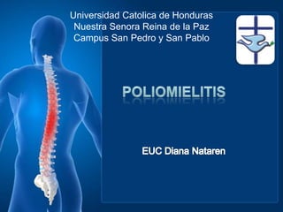 La poliomielitis es una enfermedad viral que puede afectar los nervios y causar parálisis. Es causada por el virus de la poliomielitis del tipo Picornavirus con tres serotipos. Se transmite a través del tracto intestinal. Puede manifestarse de forma asintomática, con síntomas leves como fiebre y dolor muscular, o parálisis motora grave. El tratamiento incluye reposo, terapia física y soporte respiratorio si es necesario.