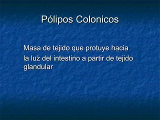 Este documento describe la poliposis colónica, incluyendo las definiciones de pólipos colónicos, su clasificación histológica, factores de riesgo, métodos de diagnóstico y tratamiento. También resume varios síndromes asociados con la poliposis como la poliposis familiar múltiple, el síndrome de Gardner y el síndrome de Peutz-Jeghers.