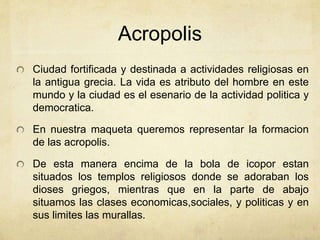 La acrópolis griega era una ciudad fortificada dedicada a actividades religiosas donde se construían templos en la cima para adorar a los dioses, mientras que en la base había edificios para funciones económicas, sociales y políticas protegidos por murallas. El documento describe cómo se representó una maqueta de una acrópolis griega utilizando materiales como cartón e icopor para mostrar la distribución de los templos en la cima y las otras estructuras en la base.