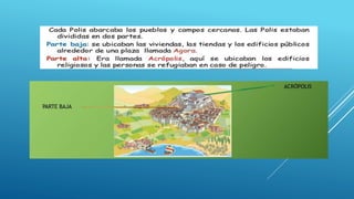 Las polis griegas eran ciudades-estado que compartían características comunes como territorios pequeños, independencia política y económica, estructuras sociales divididas, y cultura religiosa compartida. También tenían elementos urbanos similares como ubicarse en terrenos elevados, estar amuralladas, contener una acrópolis, plazas y palacios.