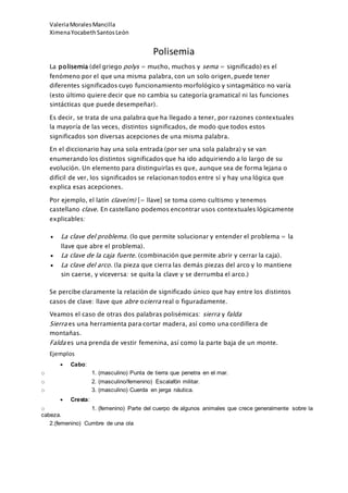 El documento explica el fenómeno de la polisemia, que es cuando una palabra tiene múltiples significados relacionados. Define la polisemia como cuando una palabra puede tener diferentes significados cuyo uso gramatical y sintáctico no cambia. Proporciona ejemplos de palabras polisémicas como "clave", "sierra" y "falda" para ilustrar cómo una palabra puede tener múltiples significados lógicamente relacionados.