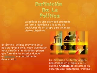 La política tiene su origen en las primeras sociedades humanas y se desarrolló a medida que los grupos humanos crecieron en tamaño y complejidad. Las primeras formas de gobierno político incluyeron a líderes tribales y las monarquías de las primeras ciudades-estado. La democracia surgió por primera vez en las ciudades-estado griegas, donde el gobierno era ejercido por consejos electos de ciudadanos en lugar de un solo gobernante. La civilización romana también tuvo un papel importante en la política a trav