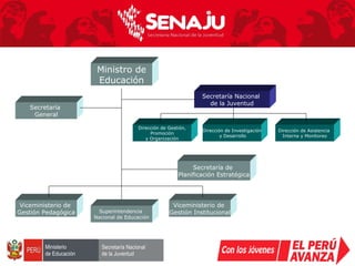 El documento describe las políticas públicas peruanas para la inclusión de los jóvenes. Establece que los jóvenes representan aproximadamente el 30% de la población peruana y describe las políticas nacionales para promover la participación juvenil, educación de calidad, empleo, salud y cultura. También presenta varios programas implementados por la Secretaría Nacional de la Juventud para apoyar la inclusión de los jóvenes.