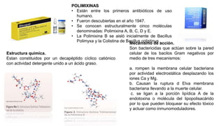 Las polimixinas son antibióticos descubiertos en 1947 que actúan contra bacterias Gram negativas. Están constituidos por un decapéptido cíclico catiónico unido a un ácido graso. Rompen la membrana celular bacteriana desplazando iones y causando la ruptura de la membrana, lo que lleva a la muerte celular. Su mecanismo de resistencia involucra cambios en la permeabilidad y composición de la membrana externa bacteriana. Son efectivos contra bacterias como Pseudomonas aeruginosa y Acinetobacter,