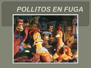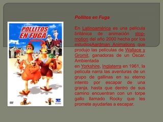 La película Pollitos en Fuga narra las aventuras de un grupo de gallinas que intentan escapar constantemente de una granja en Yorkshire, Inglaterra en 1961. En su camino se encuentran con Rocky, un torpe gallo que promete ayudarlas a escapar. La película fue producida por Aardman Animations, los estudios detrás de las películas de Wallace y Gromit, ganadoras del Oscar. Los directores Nick Park y Peter Lord ganaron fama y elogios por sus historias animadas de plastilina y arcilla, incluy