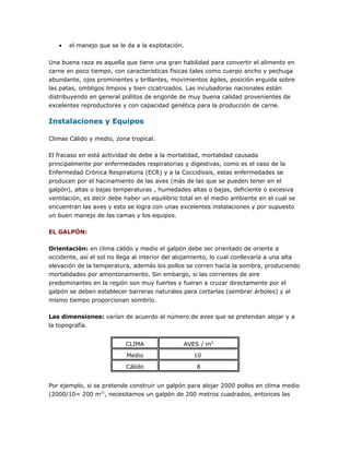 El documento proporciona información sobre el manejo de pollos de engorde desde la primera hasta la séptima semana. Detalla consideraciones generales sobre la raza, alimento, sanidad y manejo requeridos, así como las instalaciones, equipos y procesos para cada semana, incluyendo preparación del galpón, recibimiento de pollitos, control de temperatura, alimentación, pesajes, y registro de datos. El objetivo es lograr un peso promedio de 4.5 libras al séptimo semana para sacrificio.