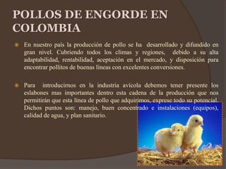 El documento proporciona información sobre la producción de pollos de engorde en Colombia. Resalta la importancia de los eslabones clave en la cadena productiva como el manejo, concentrado, instalaciones, agua y plan sanitario. Describe las dimensiones y equipos necesarios para el galpón, incluyendo comederos, bebederos, camas, cortinas y más. También ofrece recomendaciones sobre el manejo semanal de los pollos para asegurar su óptimo crecimiento.