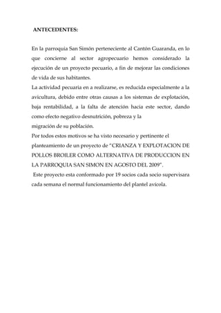Este documento describe un proyecto para criar y explotar pollos broiler en la parroquia de San Simón como una alternativa de producción para mejorar los ingresos de los habitantes. El proyecto involucra a 19 socios y incluye capacitación, adecuación de instalaciones, compra de pollos, alimentación, vacunación y comercialización de la producción. El objetivo es optimizar las condiciones de vida de los residentes a través de este proyecto avícola y fortalecer las capacidades del grupo organizado.