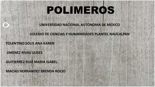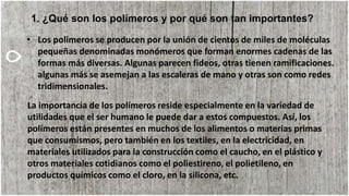 Este documento habla sobre los polímeros, sus características y clasificaciones. Explica que los polímeros están formados por la unión de moléculas pequeñas llamadas monómeros. Se clasifican en naturales y sintéticos, y pueden ser lineales, ramificados o entrecruzados. También describe los procesos de polimerización por adición y condensación para obtener polímeros sintéticos, y las propiedades térmicas y de densidad de algunos polímeros comunes como el polietileno.