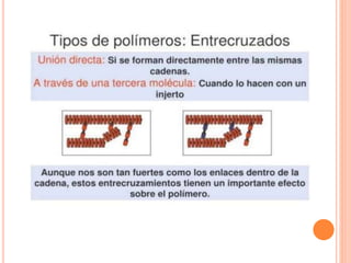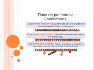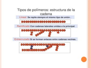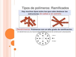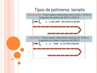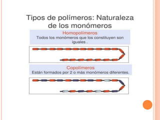 Este documento describe los polímeros, incluyendo su definición como macromoléculas formadas por la unión de monómeros más pequeños. Explica que los polímeros son naturales o sintéticos, y cubre temas como su estructura, clasificación, propiedades, obtención y efectos ambientales.