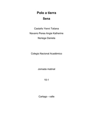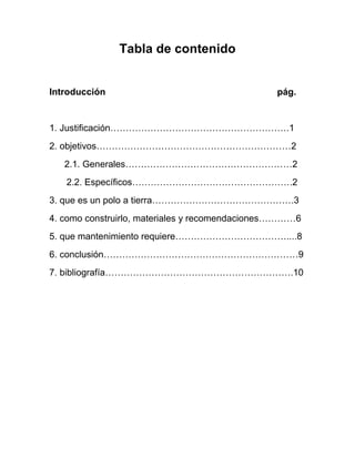 El documento explica cómo construir un polo a tierra, incluyendo los materiales necesarios y los pasos para la construcción. Un polo a tierra desvía las sobrecargas de corriente hacia la tierra para proteger personas y aparatos. Se requiere una varilla de cobre enterrada en la tierra y conectada a un cable de cobre. El mantenimiento incluye comprobar periódicamente la resistencia del polo a tierra.