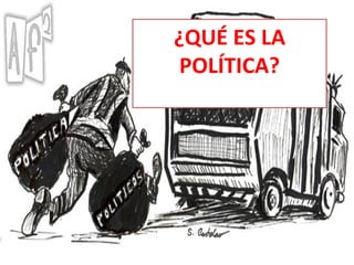 El documento presenta tres definiciones de política. La primera es una visión negativa que la describe como corrupta. La segunda es una visión institucional que la define como la gestión del Estado y los partidos políticos. La tercera es una visión crítica que sostiene que la política incluye todo acuerdo, cooperación o conflicto en la toma de decisiones sociales. El documento también presenta una actividad que pide analizar la organización política chilena actual aplicando al menos ocho conceptos del mundo grecorromano.