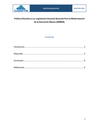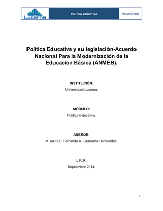 Este documento resume un documento sobre la Política Educativa y el Acuerdo Nacional para la Modernización de la Educación Básica (ANMEB) firmado en 1992 en México. El ANMEB propuso transformar el sistema educativo básico para asegurar una educación de calidad que mejore la productividad y calidad de vida. Sin embargo, 22 años después, el sistema educativo mexicano sigue rezagado debido a la mala aplicación de programas y la falta de un seguimiento adecuado que priorice resultados de calidad por encima de intereses polí