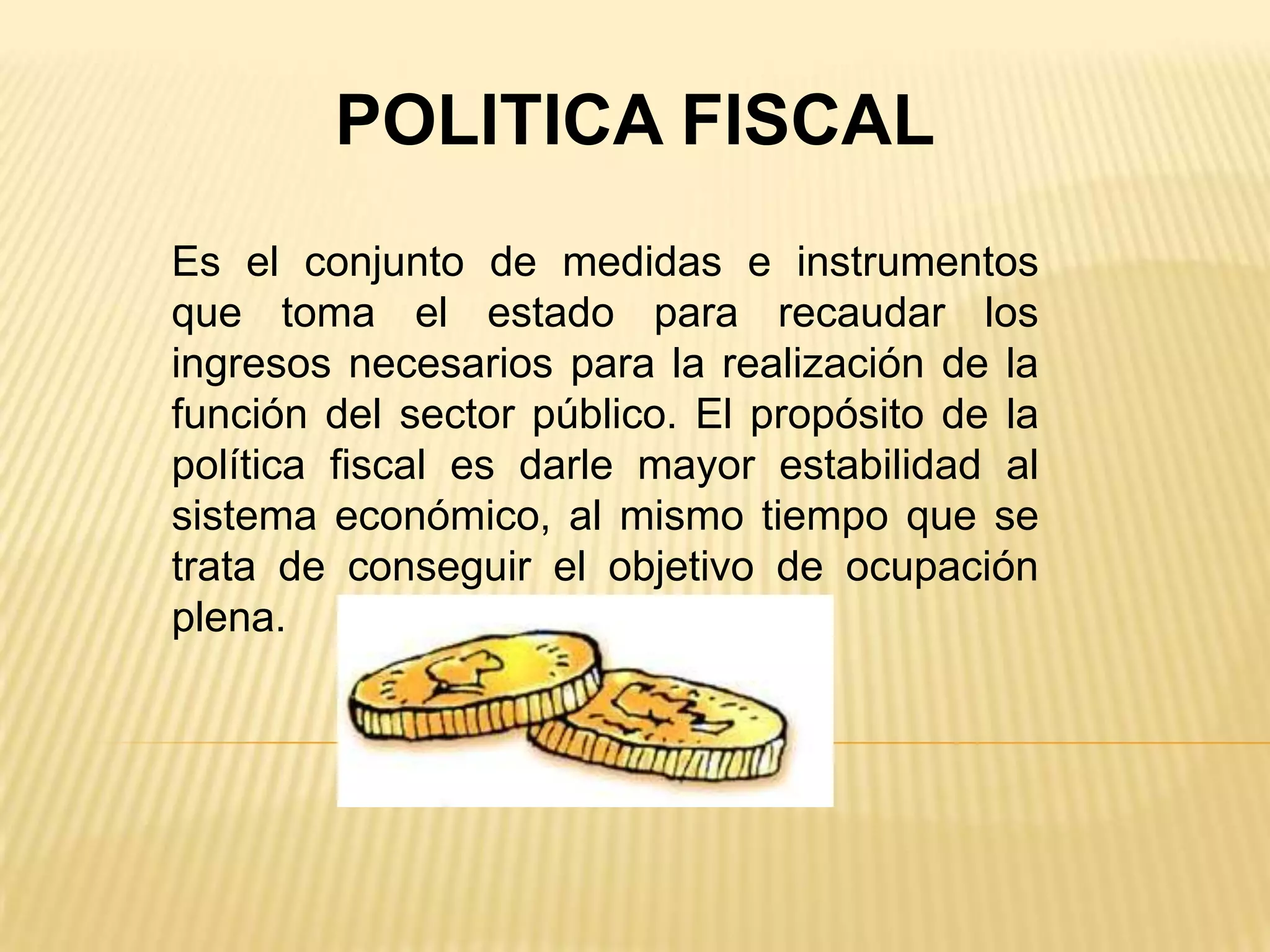 La política fiscal tiene como objetivos lograr el pleno empleo y controlar el déficit o superávit mediante los impuestos y el gasto público. Se puede aplicar una política fiscal expansiva para estimular la demanda agregada o una política restrictiva para frenar una excesiva expansión. Los mecanismos principales son variar el gasto público, especialmente en inversión, o variar los impuestos para estimular el consumo.