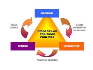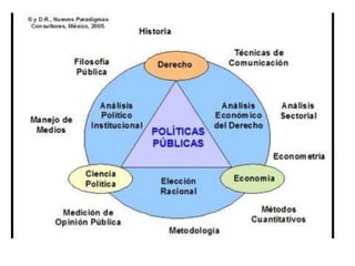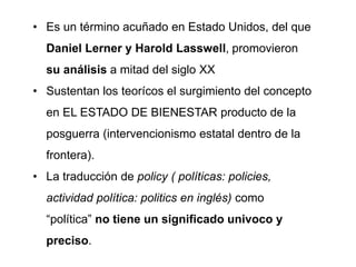 Este documento presenta una introducción al concepto de política pública. Explica que la política pública surgió como un término acuñado en Estados Unidos a mediados del siglo XX y que se refiere al conjunto de objetivos, medios y acciones definidos por el Estado para abordar problemas sociales. También presenta diferentes definiciones de política pública dadas por autores como Roth, Salazar y Vargas. Finalmente, destaca que la política pública implica la acción del gobierno y la interacción con diversos actores sociales para establecer e implementar cursos de