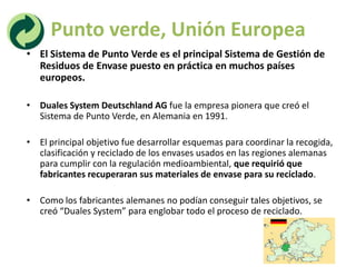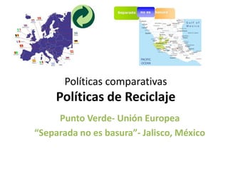 El documento compara las políticas de reciclaje en la Unión Europea y Jalisco, México. En la UE, el Sistema de Punto Verde coordina la recogida, clasificación y reciclado de envases a través de organizaciones privadas o municipales en cada país. En Jalisco, el programa "Separada no es basura" promueve la separación y disposición adecuada de residuos a través de la participación social. Mientras la UE organiza la acción medioambiental desde el productor, en México recae más en el consumidor.